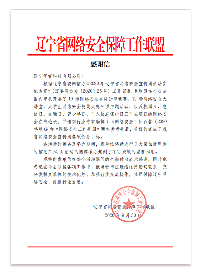 遼寧省網(wǎng)絡(luò)安全保障工作聯(lián)盟致——遼寧華睿科技有限公司“感謝信”。