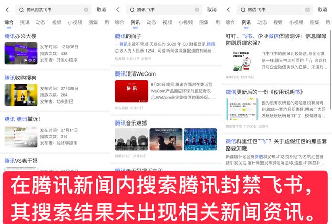 此外,有網(wǎng)友反饋,在騰訊新聞App內(nèi),相關(guān)媒體報(bào)道的分享轉(zhuǎn)發(fā)按鈕徹底消失了,而在騰訊新聞內(nèi)搜索"騰訊封禁飛書",其資訊頁搜索結(jié)果不會(huì)出現(xiàn)相關(guān)新聞報(bào)道。希望騰訊新聞作為一個(gè)新聞平臺(tái),能夠公平、公正、客觀地呈現(xiàn)報(bào)道,停止干預(yù)輿論傳播秩序。