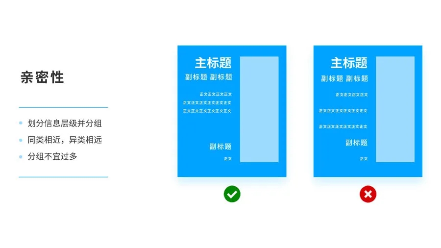 同類相近,異類相遠(yuǎn),相關(guān)的元素距離靠近,歸組在一起,成為一個(gè)視覺(jué)單位,而不是多個(gè)孤立分散的狀態(tài),這樣有助于組織信息,減少混亂,讓結(jié)構(gòu)變得更清晰。根據(jù)文案內(nèi)容,進(jìn)行合理的分組和歸類。