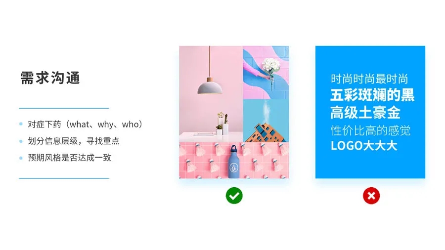 Ps:關(guān)于第3步風格溝通,建議雙方用圖片交流和表達。畢竟每個人對“高大上”的理解都是不一樣的,有的人認為是五彩斑斕的黑,有人認為是大量的留白。