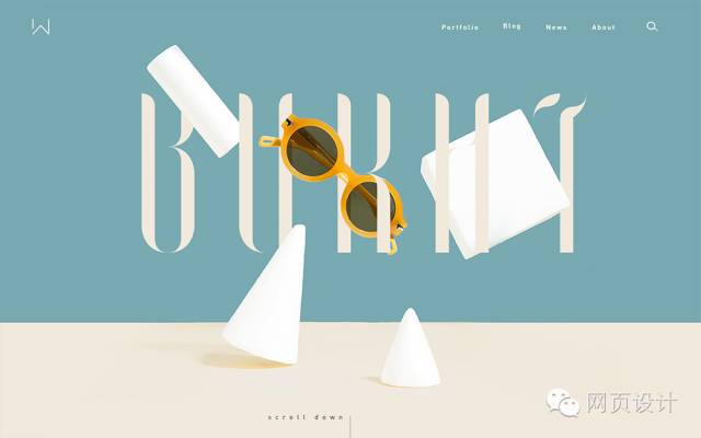 這個(gè)頁(yè)面設(shè)計(jì)中,字母與靜物交相融合的區(qū)域位于正中,成為虛焦點(diǎn),而利用色彩的對(duì)比,那副黃色眼鏡又從虛焦點(diǎn)的區(qū)域突出出來(lái)成為實(shí)焦點(diǎn)